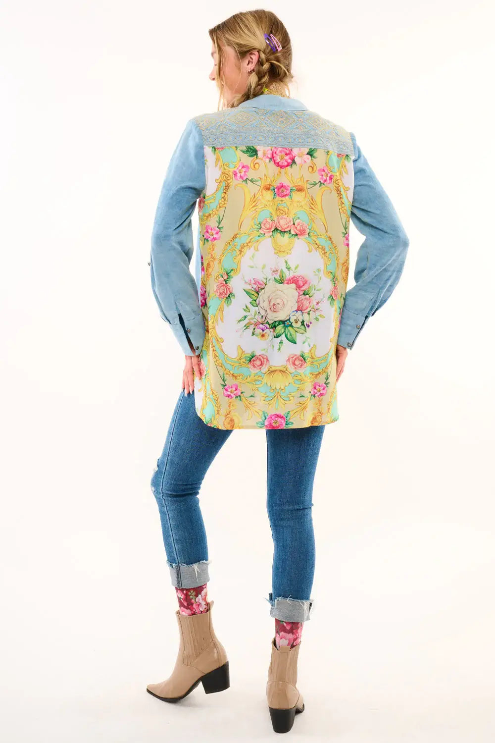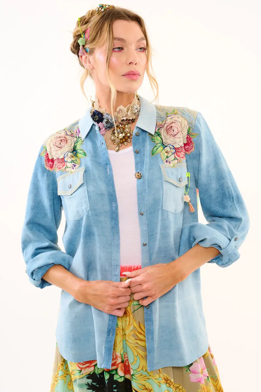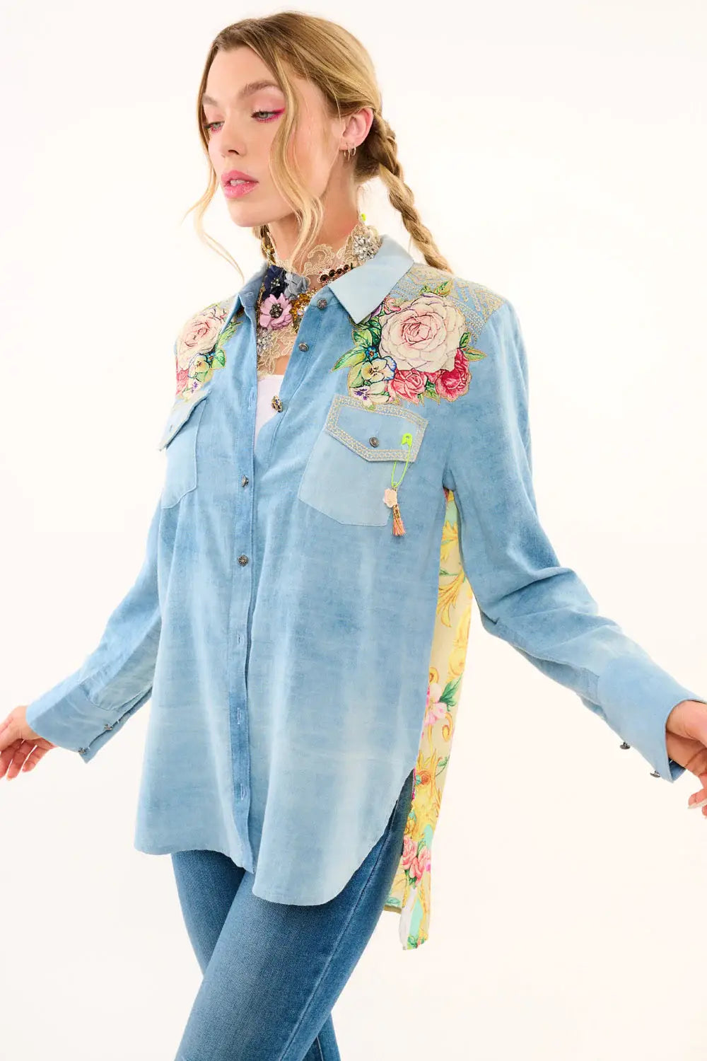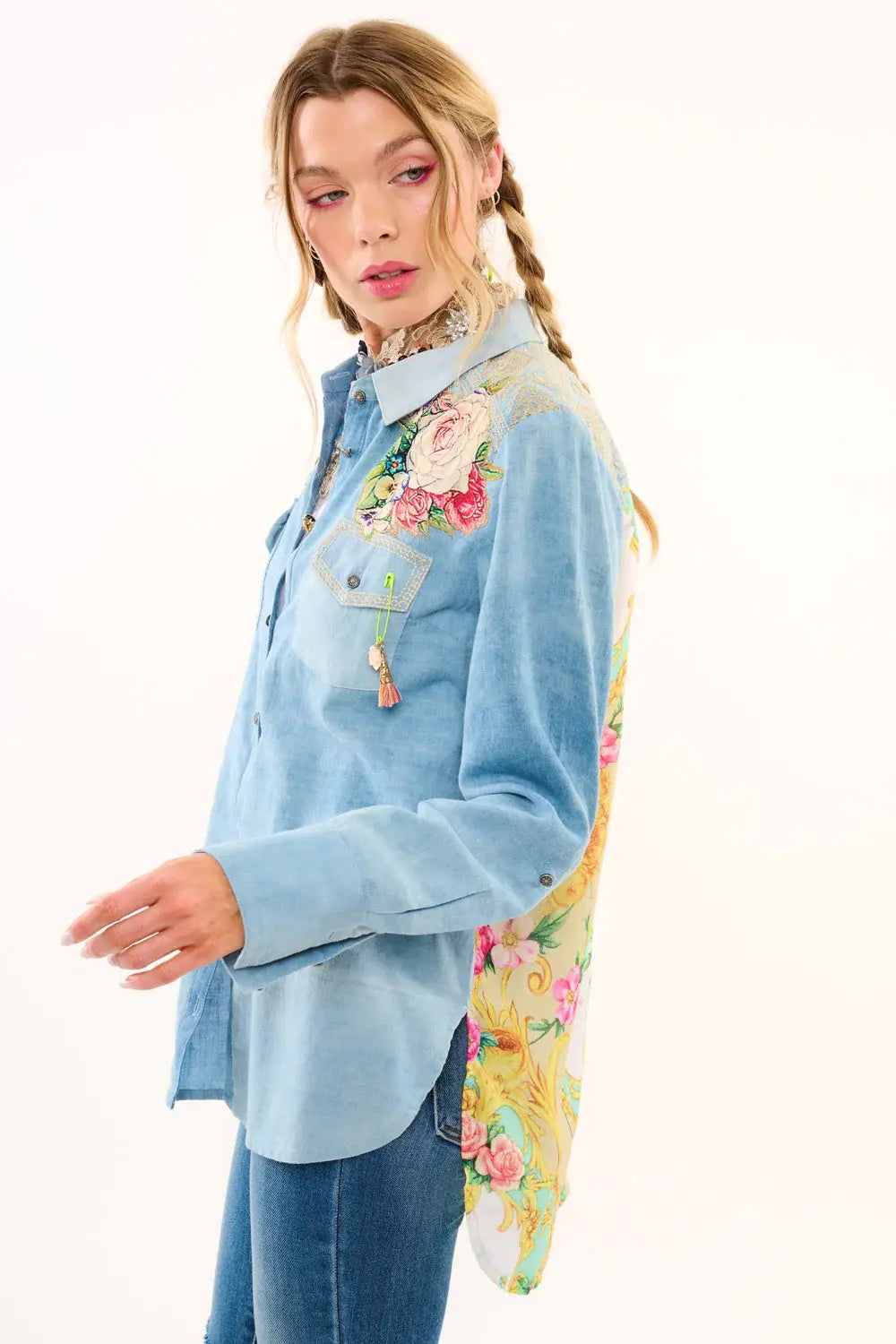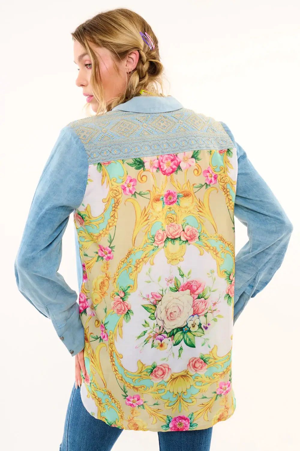 Washed denim long-sleeve button-down shirt with contrast floral print back, embroidered back yoke/pocket flaps, 2 rose floral patches sewn on front shoulder, 1 floral tasseled pinned to the left flap of the pocket.