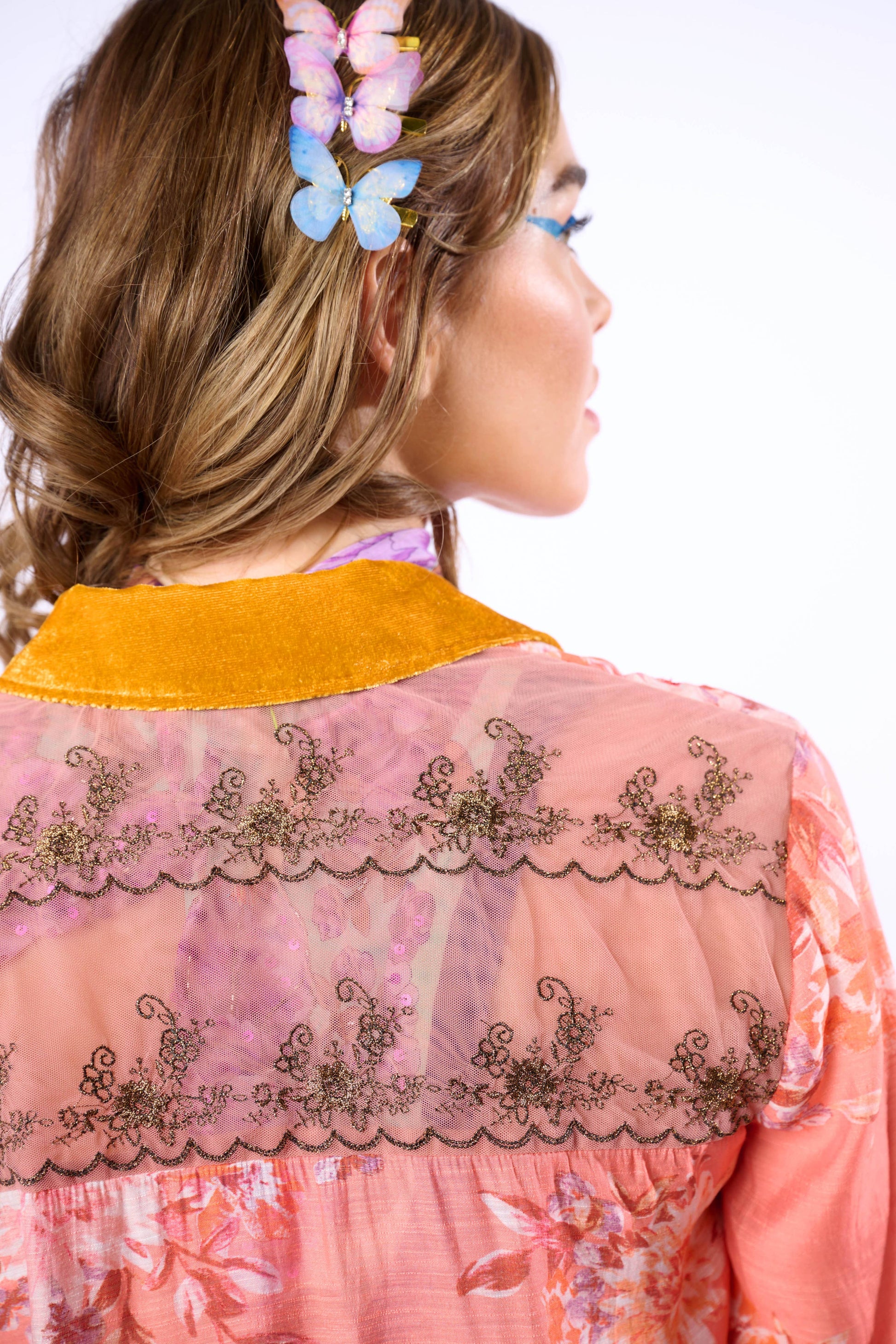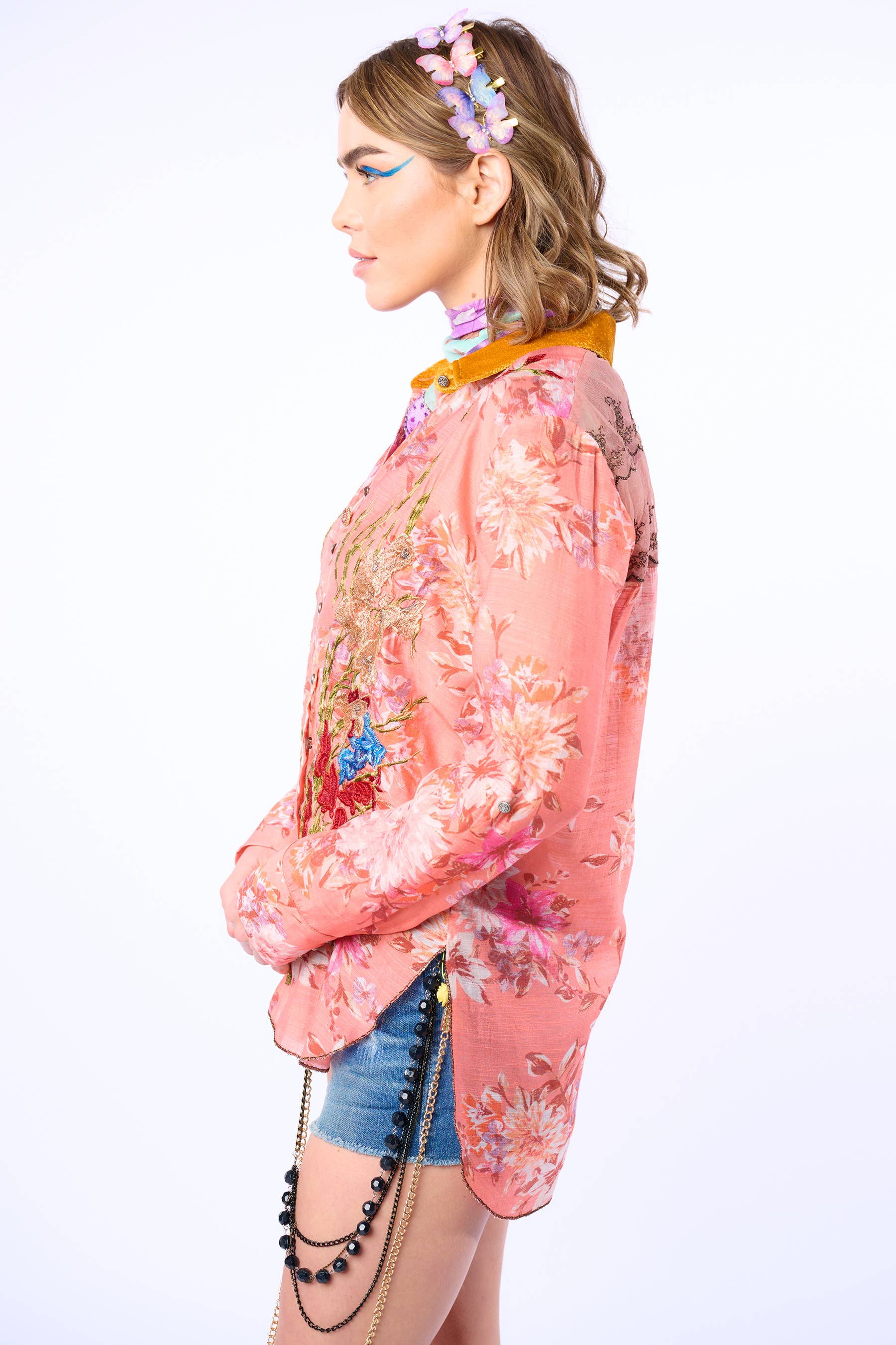 Washed floral print embroidered button-down shirt, velvet collar/collar stand, embroidered mesh back yoke, front with metallic button closure, center front placket with 1 crystal button, high-low hem