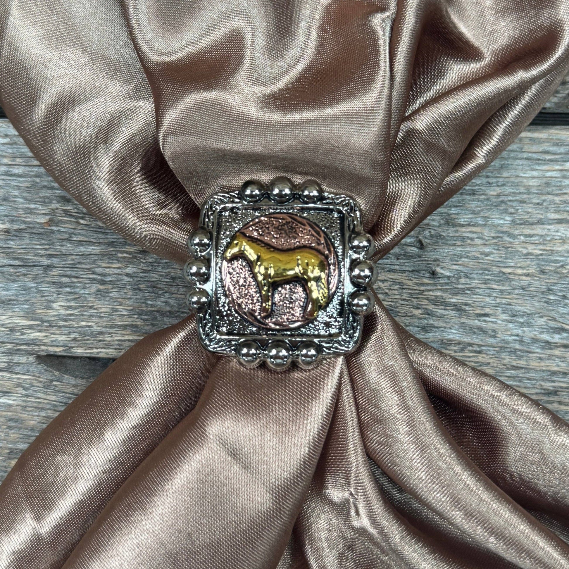 Decorated with a golden horse on copper background. This measures at 1.5". It will match any wild rag with a square shape. The slide adapter is easy to install and can be tied in a traditional or fancy knot.